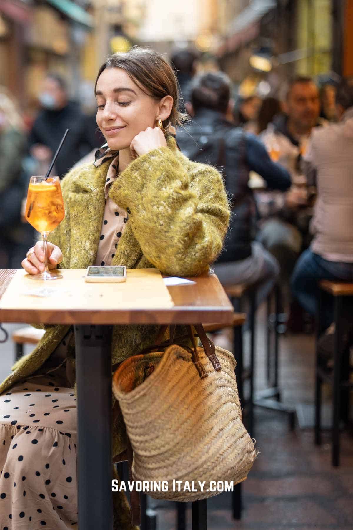 The menu usually has Italian spritzes with Campari or Aperol, Prosecco, wine, even non-alcoholic stuff like crodino. Aperitivos are a key part of Italian life, especially in Bologna. If you're in Italy, you've got to try it.