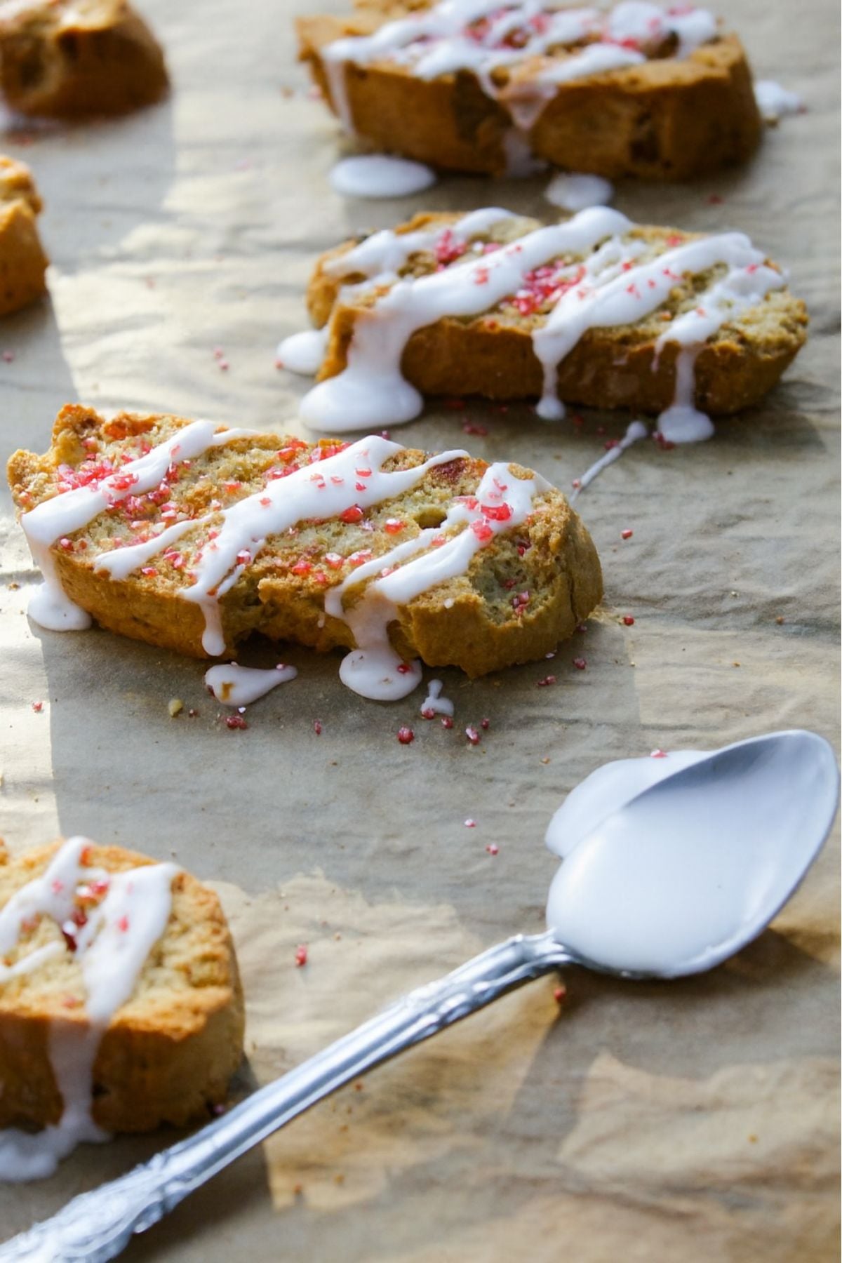 These biscotti get better on the 2nd or 3rd day (if any are left!). These spicy biscotti drizzled with a simple sugar glaze and a little sparkle make them a lovely holiday cookie to bake and share with those you love.