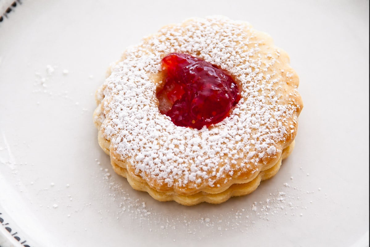 Place cookies that are cut out on top of cookies spread with jam. Press gently together. Sprinkle cookies with confectioner's sugar. With pastry bag, pipe in a little more jam into the center of each cookie.
