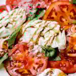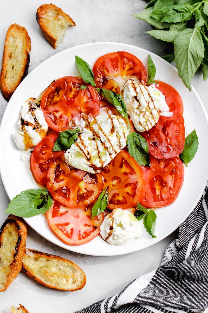 I couldn't wait to share one of my all-time favorite summer salads, a CAPRESE! It is made with sweet and juicy tomatoes, fresh basil right from my garden, and my absolute favorite, BURRATA! Yes, I do get a little excited about burrata! Don't you?