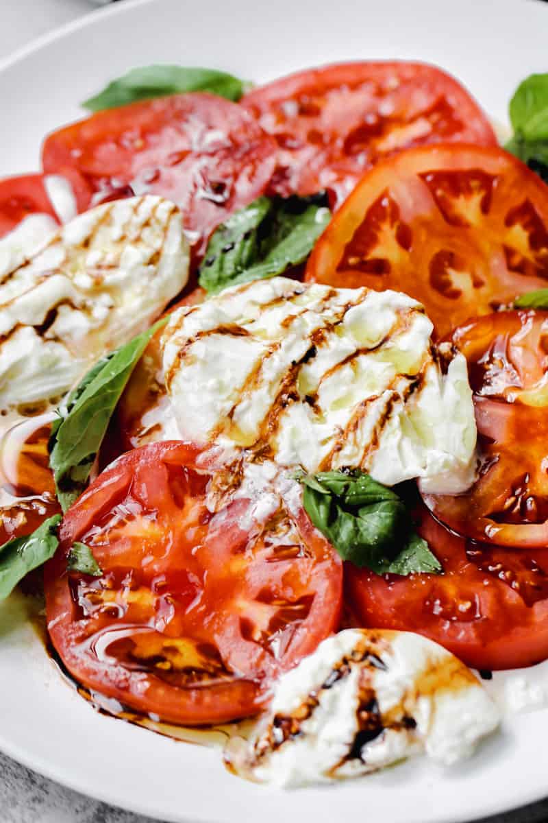 This burrata caprese is the ultimate summer salad. Fresh tomatoes, creamy burrata cheese, fragrant basil, and sweet balsamic glaze make it irresistible.