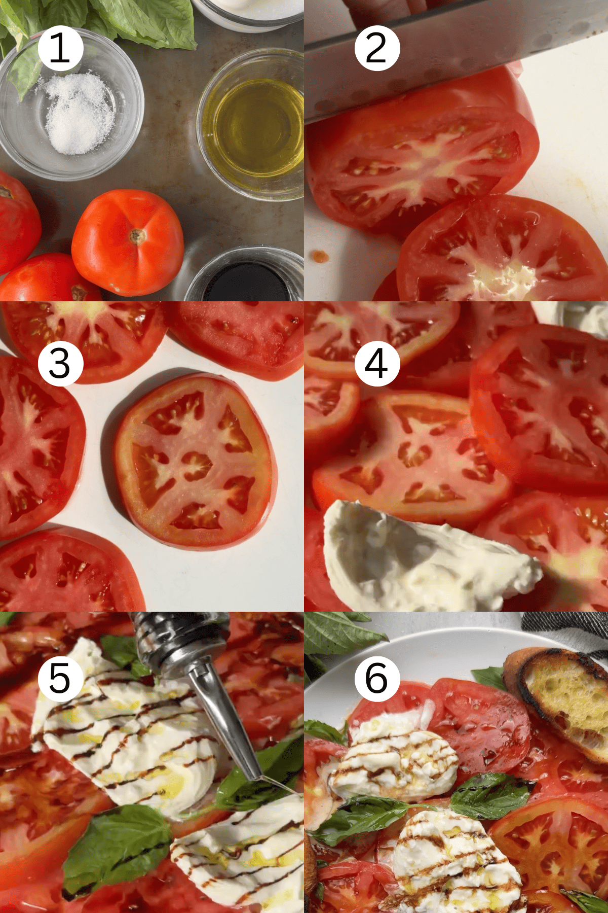 - Step 2: Slice tomatoes. Rinse and dry the tomatoes. With a sharp knife, cut tomatoes about ¼ inch thick disks.