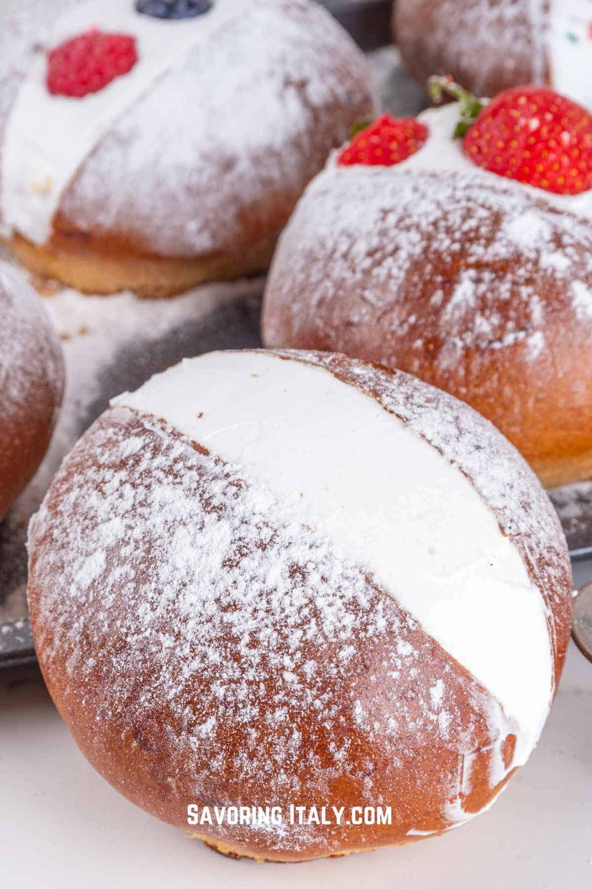 Now, Maritozzi are different. Think sweet buns full of whipped cream. They're baked, sliced, and stuffed with cream. Some add mascarpone or swap sugar glaze for red ale syrup.