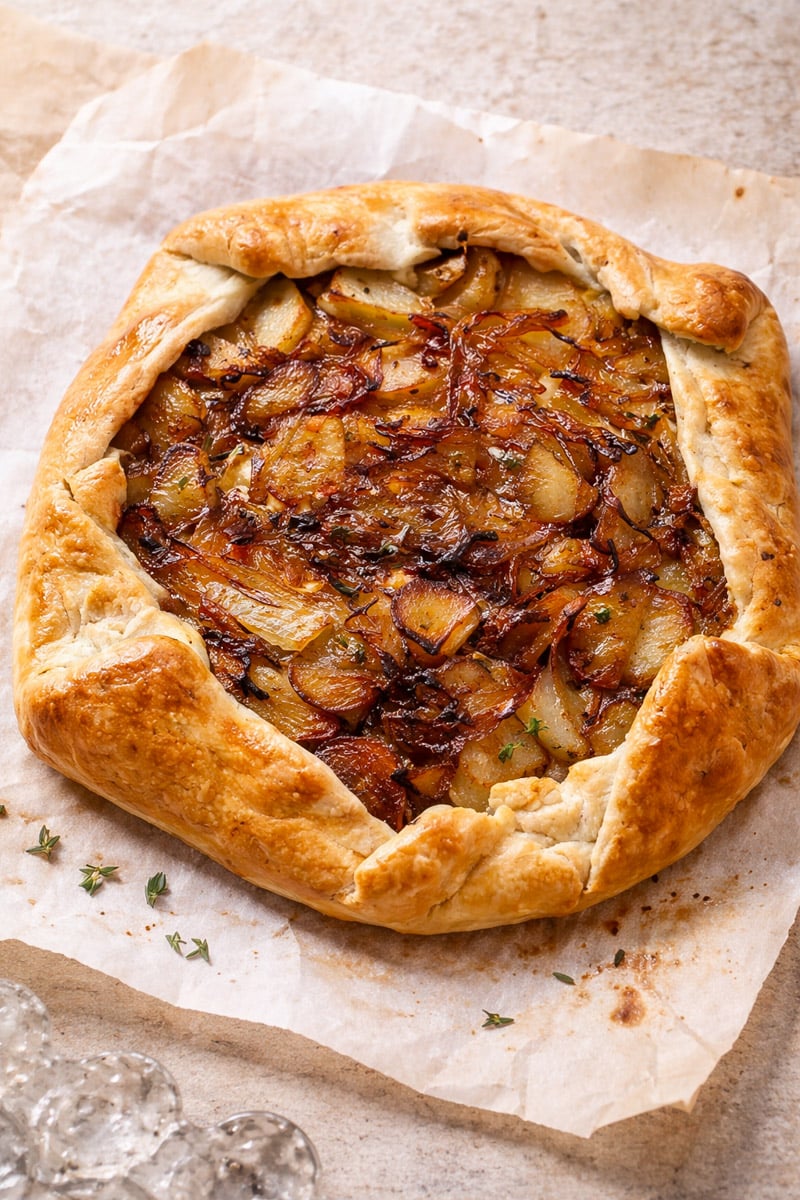 This savory potato galette recipe is rustic, flaky, and packed with flavor. Thinly sliced potatoes, sweet caramelized onions, and salty feta cheese bake inside a buttery free-form crust with beautifully pleated edges.
