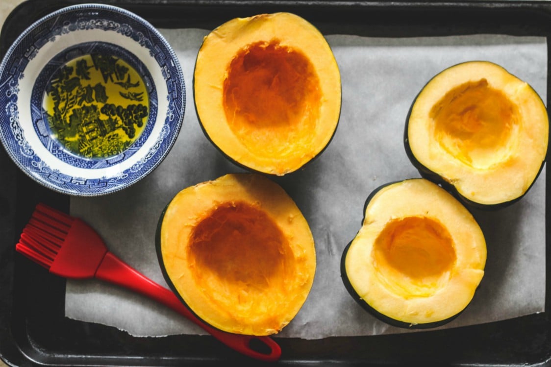 Once you have your squash sliced in half, simply spoon out the seeds. Brush the insides with the extra-virgin olive oi. Season with salt and pepper. I used my hands to really rub in the oil and salt and pepper.