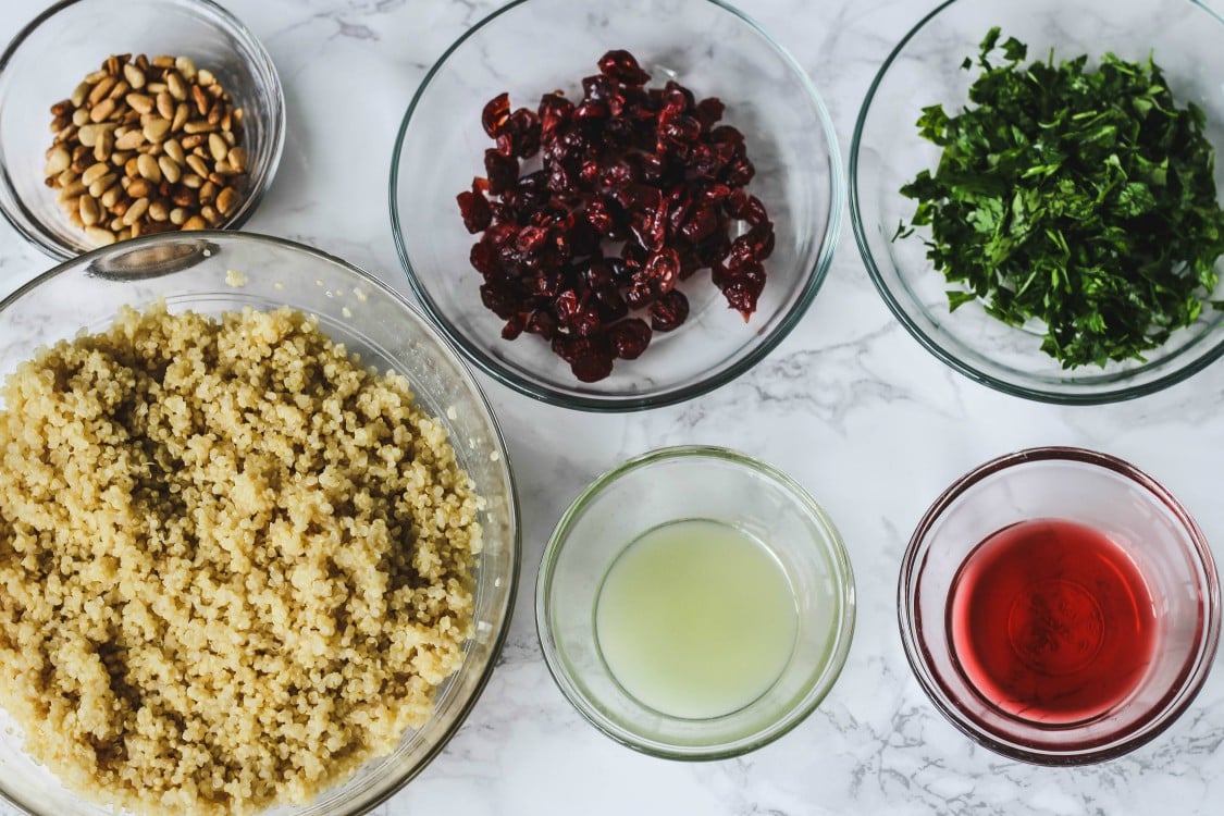 When they're cooking up, prep the quinoa. Once the quinoa is cooked, stir in all the other ingredients. I chopped the pinoli and left some whole to sprinkle on top. You could sub in walnuts or pistachios for the pinoli. The last thing to do is mix together the extra-virgin olive oil, fresh lime juice, and red wine vinegar.