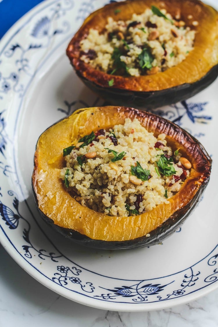 Stuffed Acorn Squash with Quinoa, Dried Cranberries and Pinoli - A healthy side dish, perfect for fall, delightful for any holiday. Serve it as a main for your vegan friends!