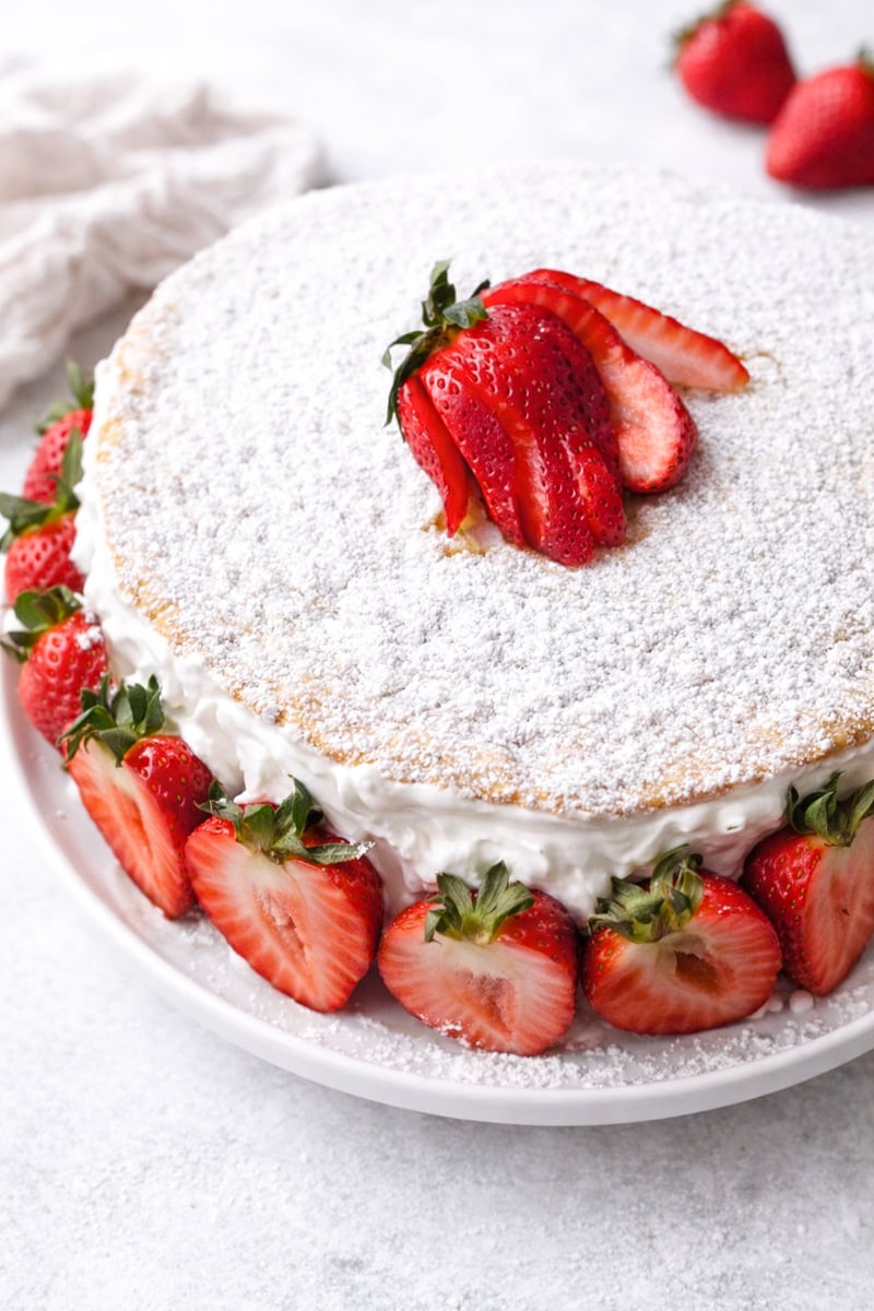 - Let the strawberries cool down for a few minutes and spread on one portion of cake.Spread on top of the strawberries with a spatula the stabilized whipped cream,ending with the second layer of cake. With the spatula, spread the remaining whipped cream on the sides and decorate with the additional strawberries leaving stems on and cut into half. Sprinkle with powdered sugar.
