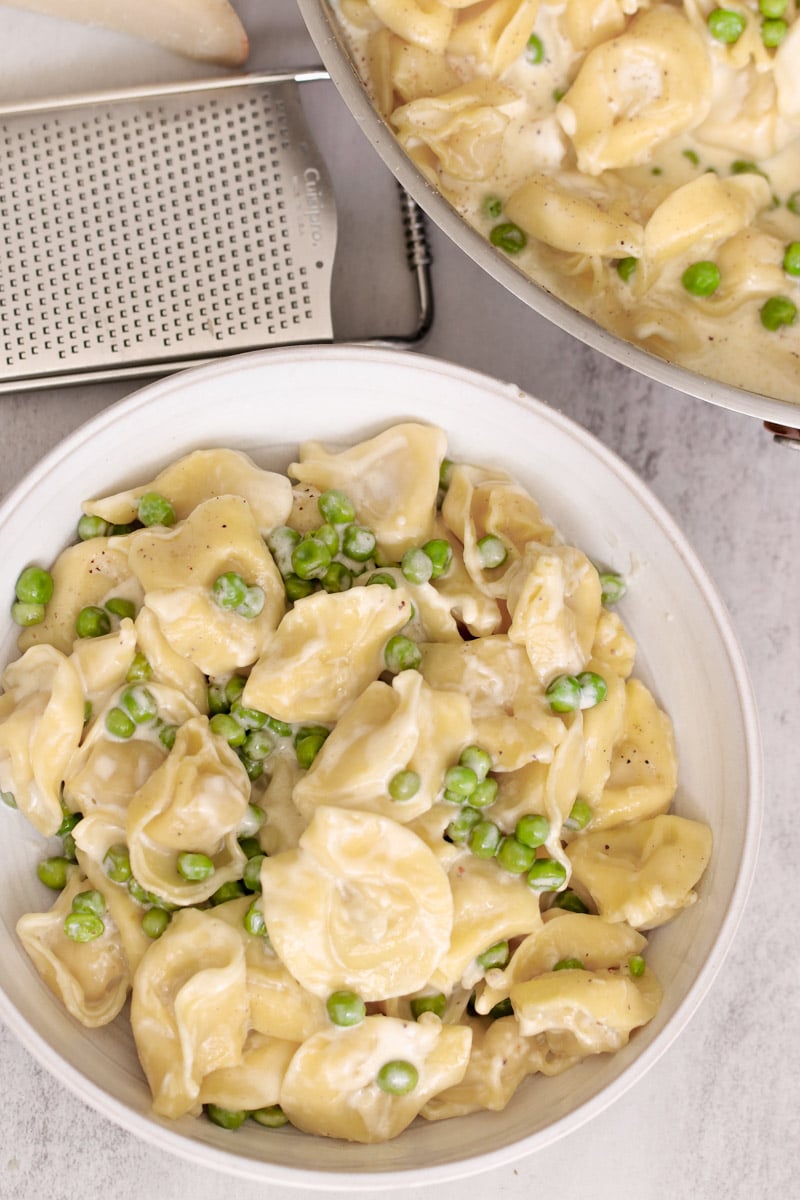 – 1 lb fresh or frozen tortellini pasta I used meat, use whatever kind you like – 1 cup fresh or frozen petite peas – 1 Tablespoon extra-virgin olive oil – 1-2 cloves garlic minced – 1 ½ cups heavy cream – 1 ½ cups Parmigiano cheese plus more for serving – 1 teaspoon freshly ground nutmeg – ¼ teaspoon sea salt more, to taste – ¼ teaspoon freshly ground black pepper plus more, if you like
