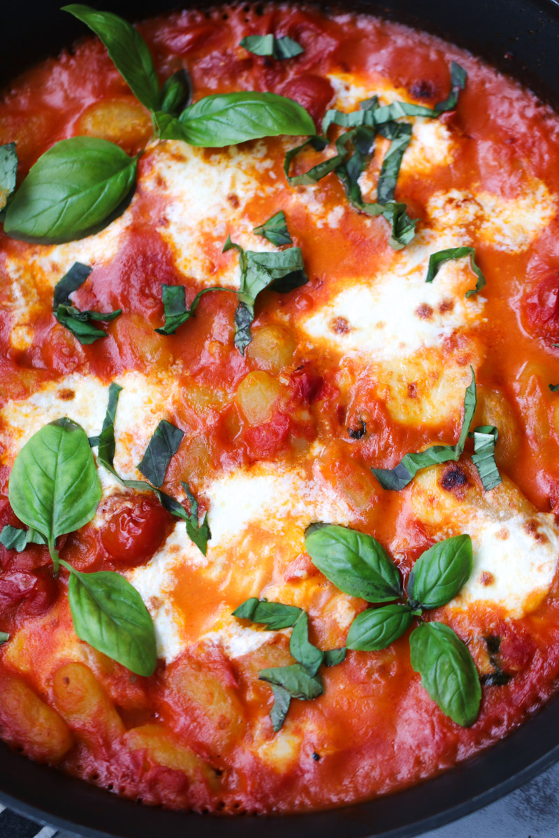 – 16 oz potato gnocchi – 3 tablespoons extra-virgin olive oil – 2 garlic cloves minced – 1 can 28 ounces whole peeled San Marzano DOC tomatoes – 1-2 teaspoons sea salt – fresh basil to your taste – 8 oz ciliegine mozzarella – 4 oz mozzarella roughly chopped or torn if you don't use ciliegine mozzarella, use two balls of mozzarella (I used burrata and ciliegine)